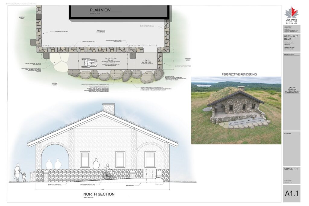 Coastal Mountains Land Trust is making an effort on our preserves to provide more people the opportunity to get outside. Over the past few months we have been working with Asa Peats Landscape Design and Enock Glidden, an accessibility consultant, to improve accessibility at Beech Hill. Guided by a design drafted by Asa Peats, Tom Jackson Landscaping of Camden installed a beautiful ramp on the building and reset all the stone stairs.