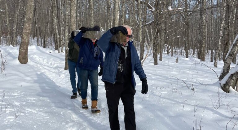 Wednesday mornings are special at Coastal Mountains Land Trust, or so I learned when I tagged along to the weekly work crew session on January 25th. Every week, members of the Coastal Mountain Stewardship team are joined by groups of volunteers to tackle trail maintenance and power through construction projects. In weeks past, volunteers have added siding to the stewardship barn, aided in blazing preserve boundaries, and installed new stone steps along trails at Fernald’s Neck. On this particular Wednesday, even amidst icy conditions, Stewardship Project Manager Ryan O’Neill and I met four tenacious volunteers at Beech Hill to remove some well-worn bridges.