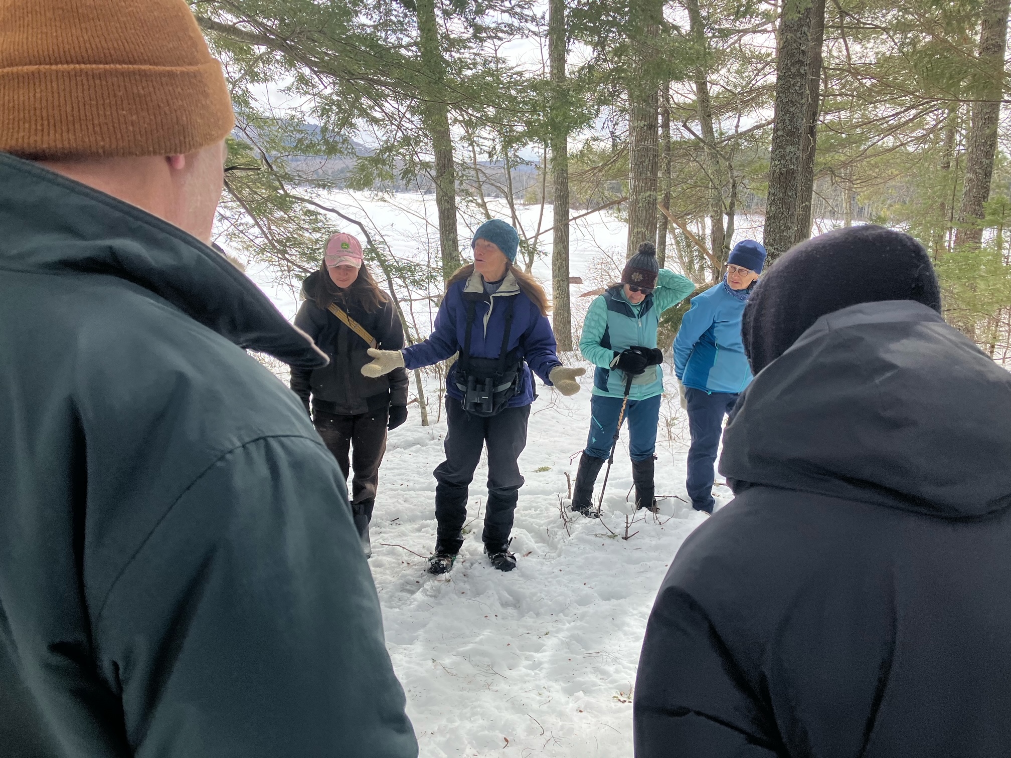 The following day, we packed the parking lot and trails of Fernalds Neck Preserve with animal enthusiasts at our Tracking Workshop! This hike and learning session was led by extraordinary naturalist and co-founder of the Belfast Bay Watershed Coalition, Cloe Chunn. With the sun peeking through the pines, it really started to feel like spring. Even with snow on the ground, we were warm and lucky to be learning from Cloe as she shared her tracking expertise with us. We learned how to tell cat from canine trails, what questions to ask when identifying prints, and where to look for wildlife along the trails.