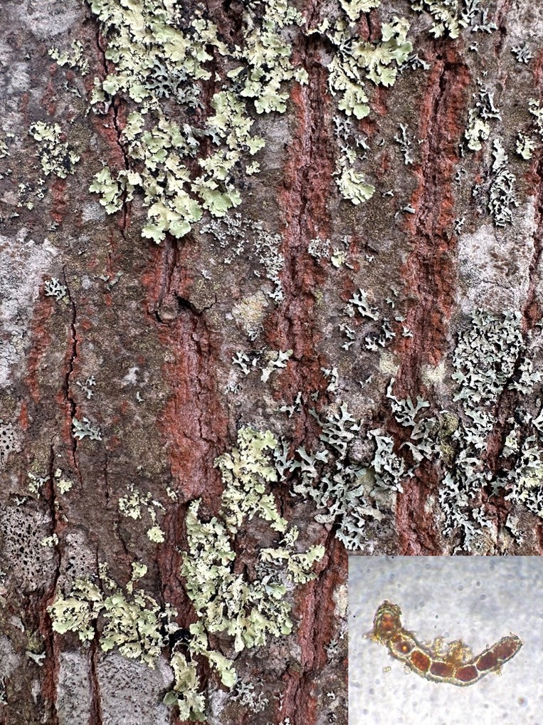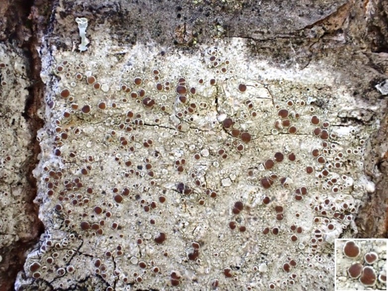 Now let’s look at two crustose lichens. Here’s a close-up of the lichen in the yellow circle in the earlier photo, most likely Bumpy Rim-Lichen (Lecanora hybocarpa). The white part of the lichen is called the thallus, and it is on, and embedded in, the bark of the tree. The red circles surrounded by a white ring (enlarged in inset at the lower right) are the fruiting bodies (apothecia). Inside the apothecia are sacs containing spores. The spores contain the fungal component of a lichen, and when they are released, they must find both a suitable substrate and an algae partner to form a new lichen. This is not as difficult as it may seem, because the algae cells can live on their own.
