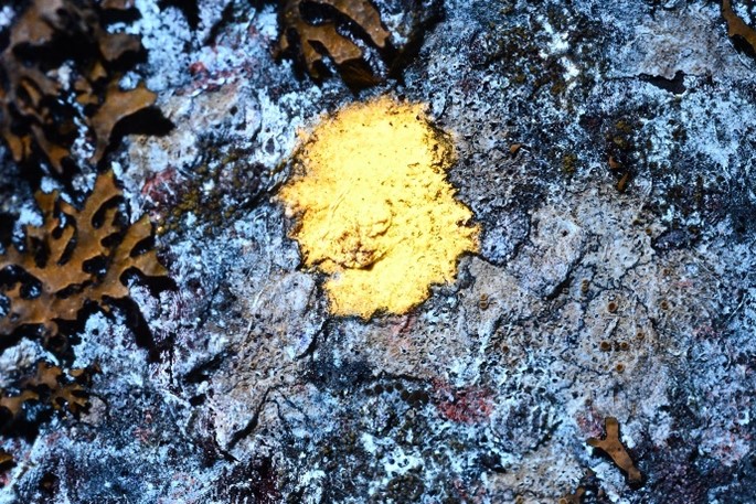 There are many other crustose lichens on the bark of this oak tree that one would normally overlook, even with a hand lens. In fact, the entire surface of the bark of the oak tree was covered, mostly with lichens. A typical small area is shown below in the left image. The 1 cm crustose lichen in the center lit up yellow under UV light (right image). I have no idea what species it is. Open book quiz: what’s the green foliose lichen on the left of the images that fluoresces orange?