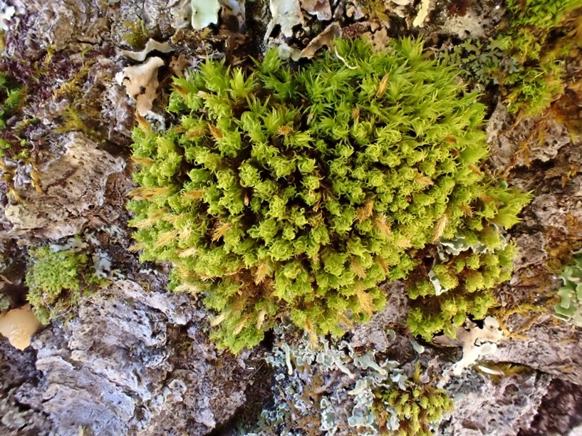 On this oak tree, it only occurred near the tree base, where there was more moisture.  It grows in small mounds as in the photo on the right.  When dry, the leaves curl up (“crisped”), hence the name crispula.  The uncurled leaves can be seen near the top of the photo.  The brown “spears” are immature sporophytes: the spore-bearing structures of mosses.