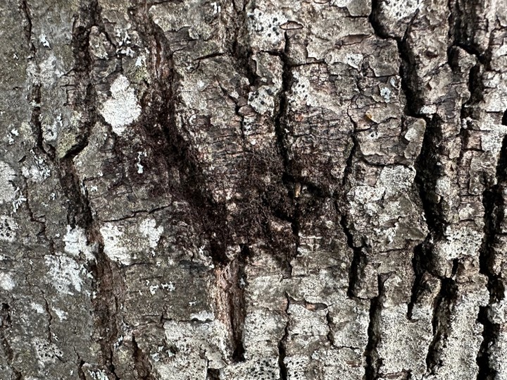 There is one other type of plant on the bark of the Red Oak that looks more like a brown (or reddish or greenish) smudge, until one gets close…
