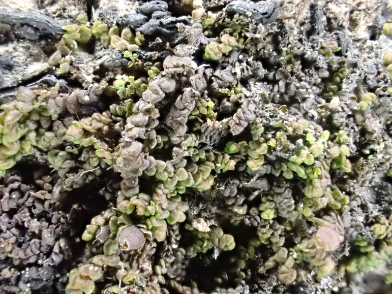 This is the common liverwort, Frullania, of which there are several species. The defining feature of liverworts is microscopic (single cell rhizines that hold the liverwort to the substrate), but Frullania is easy to recognize with a hand lens. It has tiny strands of leaves which become interwoven over time. The leaves are in two lines with a third line of leaves underneath. However, this liverwort is too small to easily visualize these lines with a hand lens.