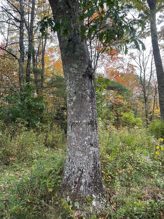 Red Oak is one of the more common trees in our Mid-Coast forest. The tree in this photo is near the side of a field in my backyard. What can grow on it is determined by the chemistry and structure of the bark, as well as the amount of moisture and sunlight that reaches the trunk.