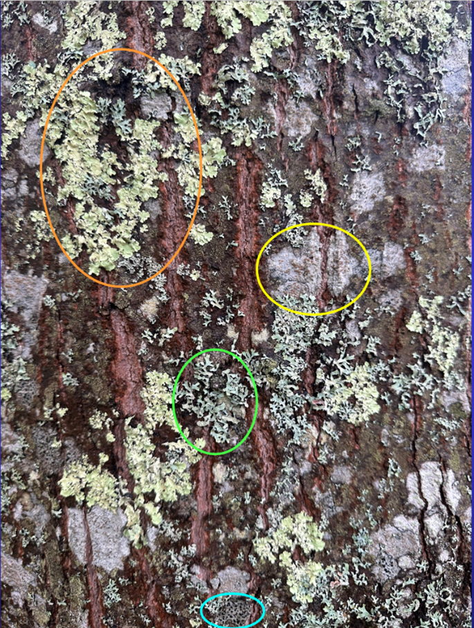 Lichens are broadly divided into those that are foliose or leafy (orange and green circles), crustose or flat (yellow and blue circles) and fruiticose or upright (none on this tree’s trunk). The four lichens shown in this photograph can be identified at least to genus, but the species identification often requires a microscope.