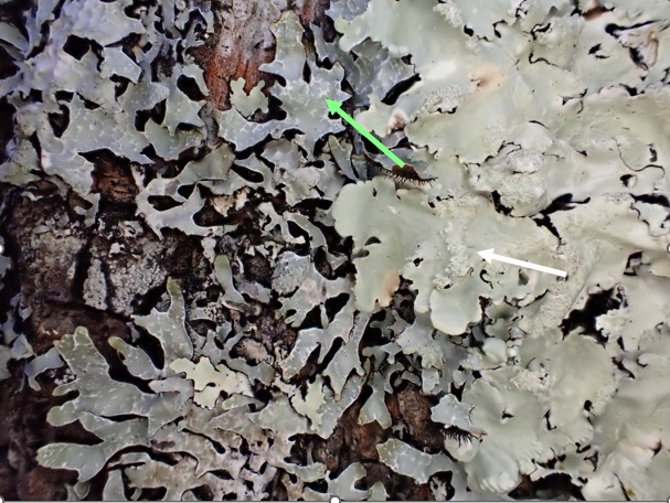 The two foliose lichens look similar on first glance, but when shown side-by-side in the photo below, they are clearly different. The lichen on the right is Common Greenshield Lichen (Flavoparmelia caperata). The yellow-green color of this lichen is so distinctive, and the lichen so abundant, that one can recognize it at a distance, even driving by in a car. Looking at it up close with a hand lens, one can see that it has a generally smooth surface with scattered white granules called soridia (white arrow), located in the middle of the lobes, which can break off to form new lichens. The lichen on the left in the photo is called Shield Lichen (Parmelia sulcata). It has narrower lobes than Common Greenshield Lichen and is often cris-crossed by white breaks in the greenish-grey cortex (green arrow) called pseudocyphellae (Do scientists think that giving something a name that’s unpronounceable is a sign of intelligence?!). It can also have soridia, but when it does, they are often located on the edges of the lobes. One need not remember any of these distinctions to appreciate the intricacies and beauty of the lichens when seen through a hand lens.