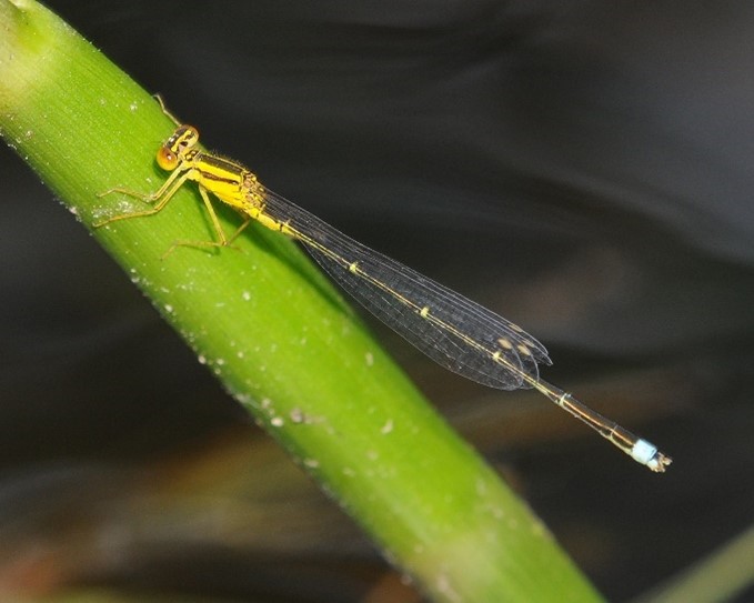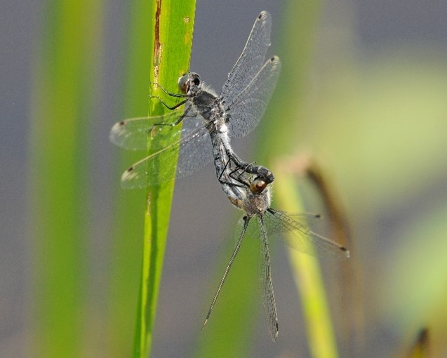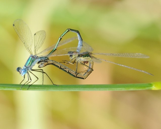 One key feature that is common to both dragonflies and damselflies is how they mate. Prior to mating, the male transfers sperm from his genital opening near the end of his abdomen (9th abdominal segment – there are 10 in total) to a sperm storage organ in its penis near the beginning of the abdomen (2nd abdominal segment). Initially, the male grabs the female on the back of the head with his cerci (appendages at the tip of the abdomen), and the female then bends her abdomen to allow her genital opening to abut the male’s penis and permit transfer of sperm into her genital opening. This creates a “wheel” configuration, best seen in the photograph below on the right.