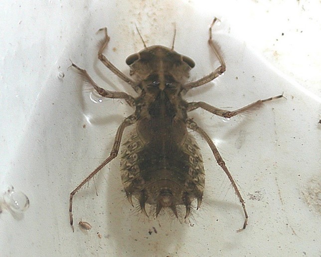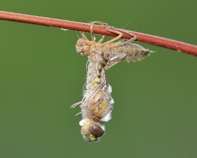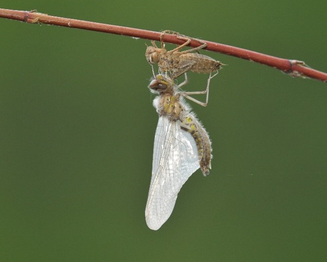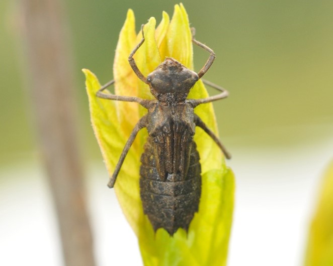 Odonate larvae are aggressive carnivores in their aqueous environment, gradually growing over the course of a year. They don’t look anything like the adults, but by the end of their aquatic existence, the fully-formed adult is present inside the larva’s exoskeleton (“skin”). In other words, they don’t undergo complete metamorphosis like a butterfly, where a pupae is formed , and the caterpillar transforms into an adult. Rather, they undergo an incomplete metamorphosis, skipping the pupal stage, with the adult emerging from the exoskeleton of the larva.