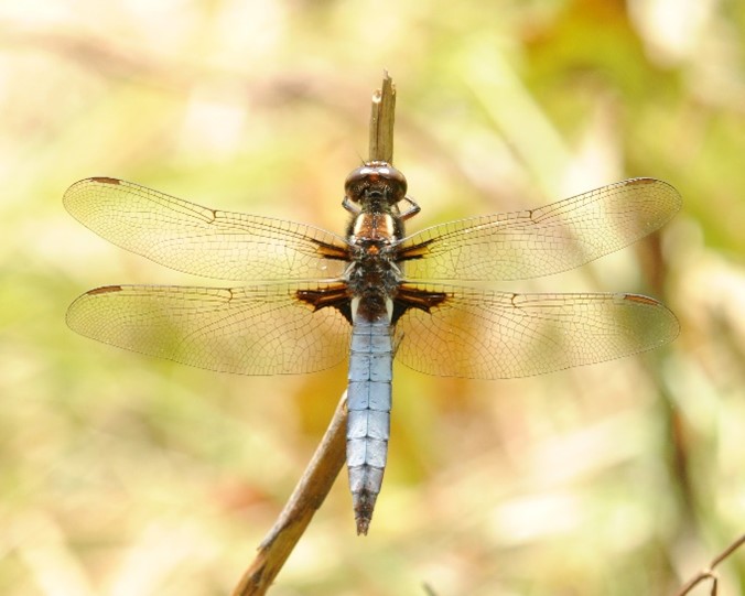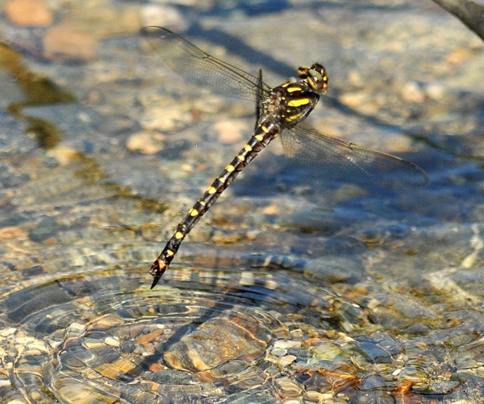 Twin-spotted Skimmer (dragonfly) ovipositing (placing eggs) directly in the water. Notice the concentric circles of waves emanating from where the tip of its abdomen touched the water. Sometimes a dragonfly will mistake the shiny paint on a vehicle for water and attempt to deposit eggs on it.