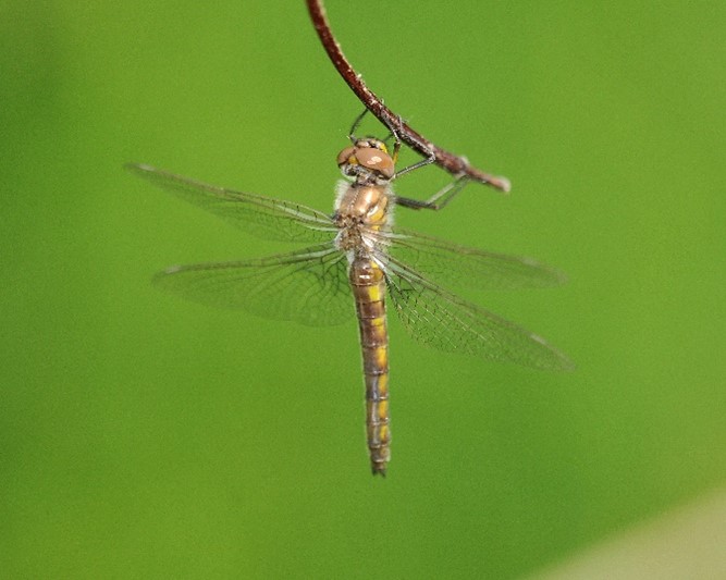 Dragonflies and damselflies are members of the insect order Odonata and together are called “odonates” by taxonomically-minded naturalists. In Mid-Coast Maine they begin to emerge from their watery confines around the last week in May. They were right on time this year, but then a week of cool, wet weather put a dead stop to the process since they only emerge and fly on sunny days.