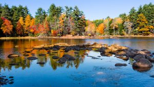 MAJESTIC PINES, BALANCE ROCK, LAKEFRONT Impressive mature pines, hemlocks, and hardwoods cover most of the peninsula. Rocky outcroppings, mosses, and mushrooms thrive among the peninsula’s dark understory. Take the Orange or White trail for Megunticook Lake access, a popular spot for summer swimming.
