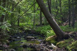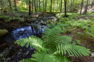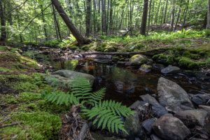 ROCKPORT HARBOR OVERLOOK, QUIET STREAM, CHESTNUT SPROUTS This loop trail is a gentle walk suitable for young families. Two hand-built footbridges cross Ott Brook, a perennial stream that is rust-colored from tannic and humic acids from an upstream wetland.