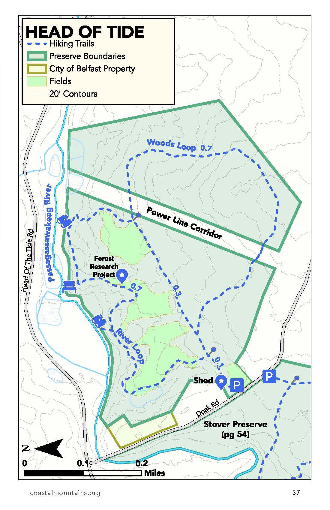 PASSAGASSAWAKEAG RIVER, OLD FARM FIELDS, PERMACULTURE GARDENS This preserve protects part of the Passagassawakeag River shoreline, as well as old fields and forests. It abuts two other parcels of land within the Passagassawakeag Greenway: the Stover Preserve and a privately-owned easement. The Blue River Loop travels along the high banks of the river. The group Belfast Transition manages an interactive and educational permaculture garden with picnic tables for the public.