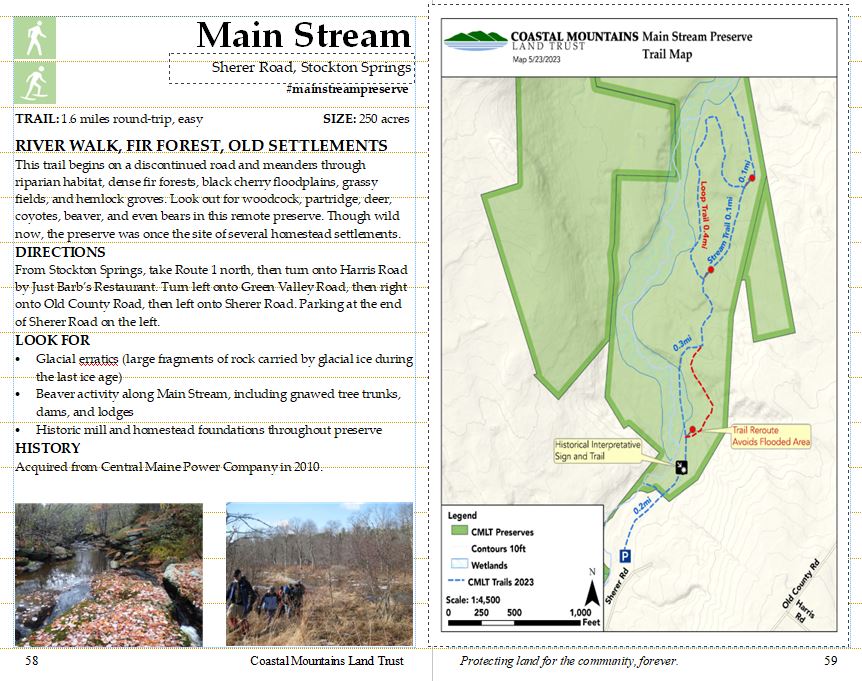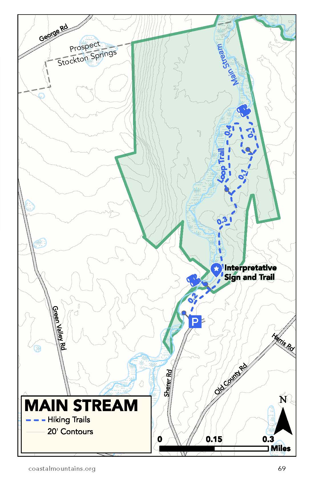 From Stockton Springs, take Route 1 north, then turn onto Harris Road by Just Barb’s Restaurant. Turn left onto Green Valley Road, then right onto Old County Road, then left onto Sherer Road. Parking at the end of Sherer Road on the left.