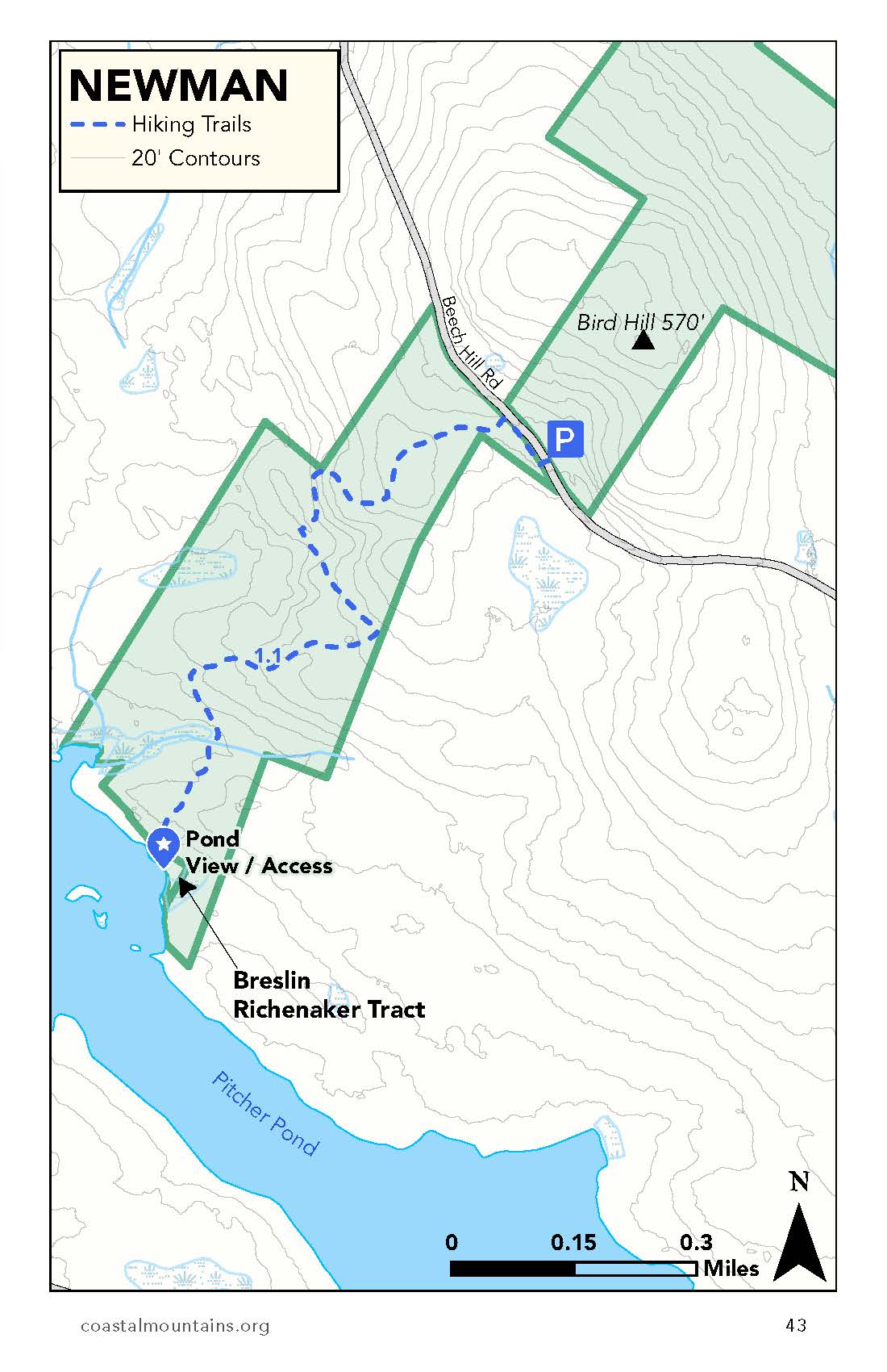 This trail descends downhill, passing through four distinct forest types. The quiet hillside hosts abundant wildlife. The trail ends at Pitcher Pond, a great spot for a picnic. Shorefront access is only available via the Newman Preserve Trail, through the Breslin-Richenaker Preserve.