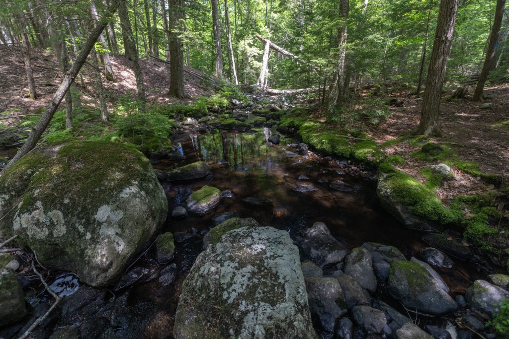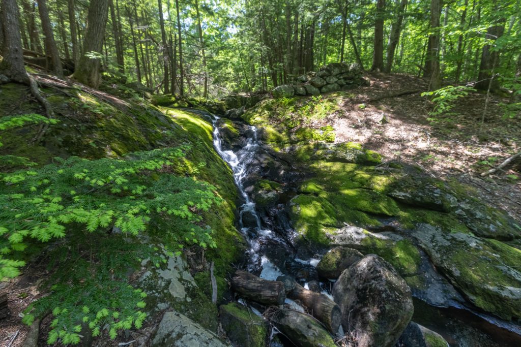 Explore the hemlock grove and historic mill site along Sucker Brook. The Hodson Loop passes mature hardwoods and apple trees. The Summit Trail crosses the forested Rheault easement to the summit of Howe Hill, a managed organic blueberry barren. Please respect the farm by staying on trail.