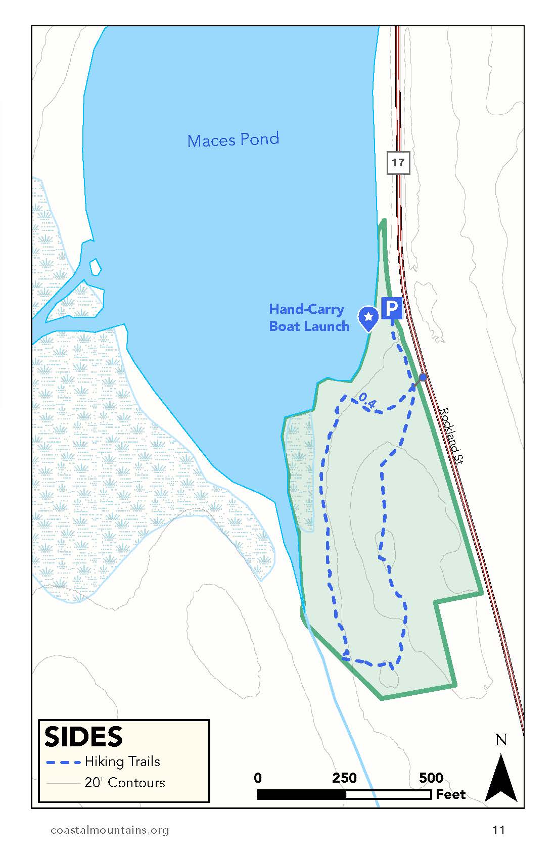 From Camden, take Route 1 south, then take Route 90 inland. After 2.5 miles, turn left onto Route 17. Drive 1.4 miles east on Route 17. Roadside parking is on the right immediately after Maces Pond. Look for the preserve sign at the road.